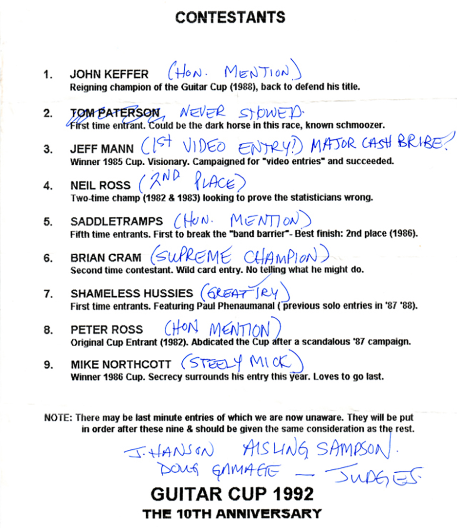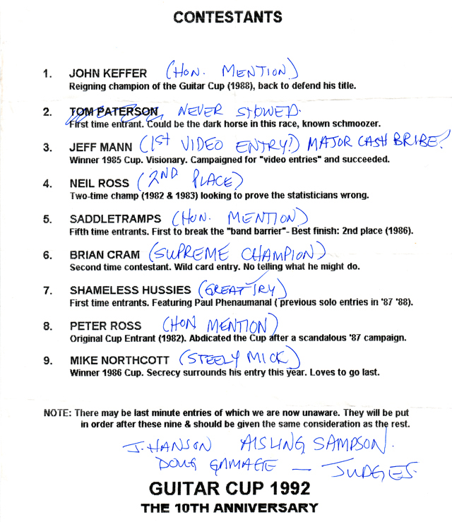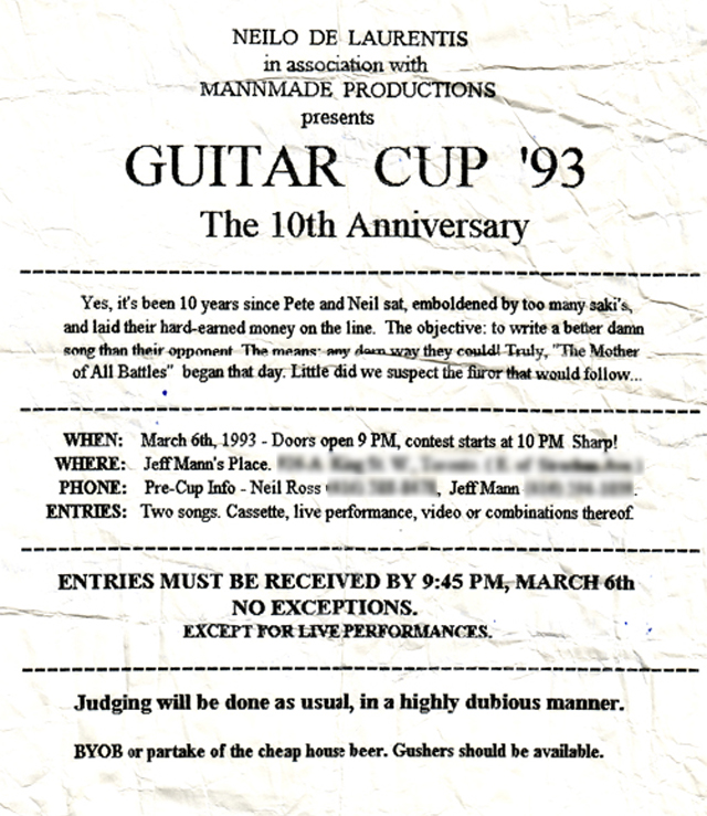 Realizing that the 10th anniversary of Gcup was slipping past, we hastily organized a scaled-down party at Jeff Mann's apt on King St in Toronto. We had a good number of entries, I recall and I believe someone had a canister of laughing gas that night. We were all in a party mood and the 3 year layoff had got people into it again.